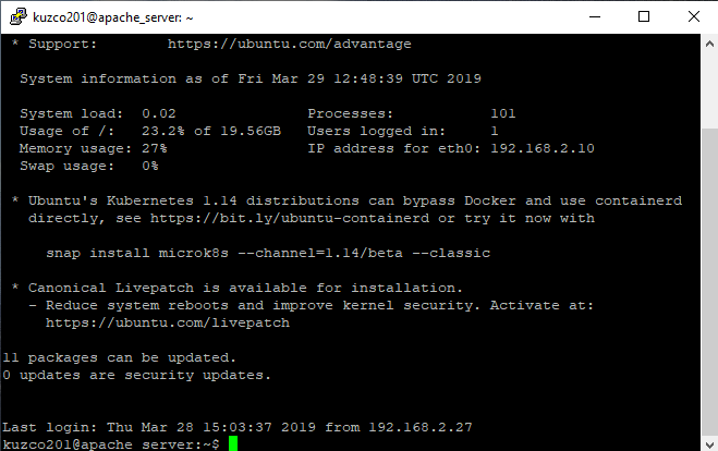 Here you can see that I made a SSH connection to my Ubuntu webserver. I use Putty as my SSH terminal. SSH is encrypted using PGP (Pretty good privacy) which uses a public and a private key to communicate with each other. This is especially helpful because you don't need to transfer passwords to encrypt the connection. The sending client encrypts its message using the public key from the recipient and the recipient decrypts the message using its own private key. This works the same the other way around. I can use this technique to remotely manage my webservers without the need physical access.