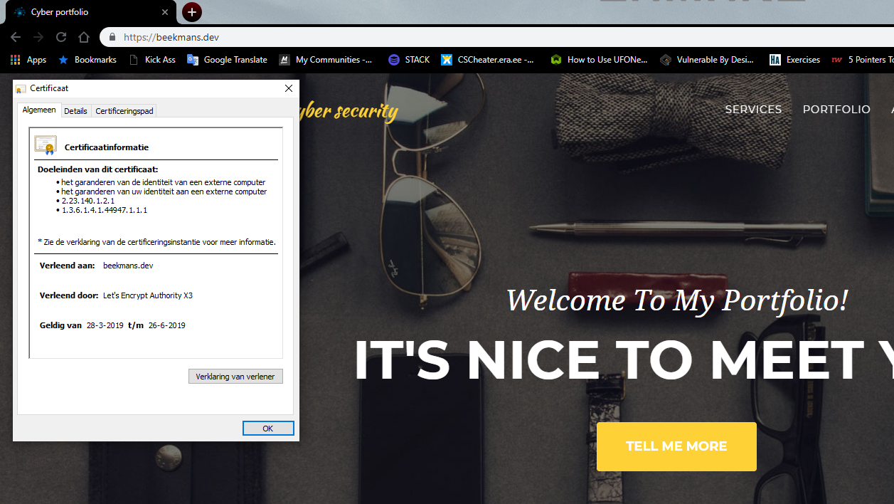 Here you can see the ssl certificate I created for the website that is running my portfolio. I created the script using certbot in Ubuntu and the CA is Let's encrypt authority x3. The website automatically forces all traffic to https, the website is still accessible by http but will redirect the user to https.