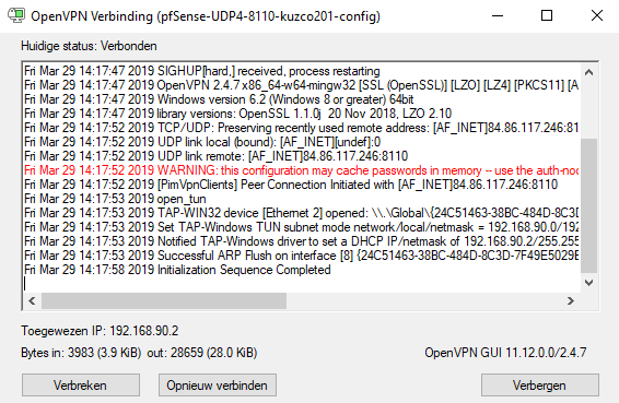 Here you can see that I'm connected to a VPN. This VPN is OpenVPN and runs on the PfSense router. It gives me access to the subnets I gave it access to and with this I can remotely manage my whole network, with being actually physically connected to the network. The OpenVPN connection is encrypted be TLS (Transfer layer security) which is successor from SSL. TLS uses a handshake at the start of the connection where a key is shared between the 2 clients. This key will be used for the symmetric encryption of the messages. The authenticity of the connection is secured by a certificate and the public key of the webserver this prevents possible man in the middle attacks, where someone will pretend to be another website for example.