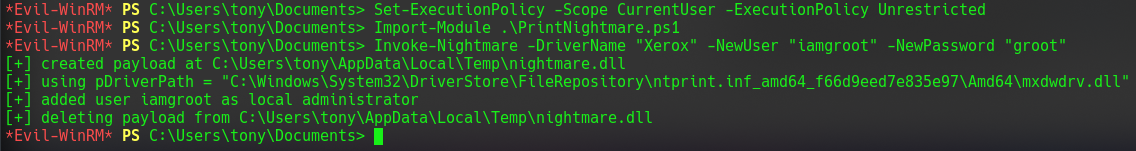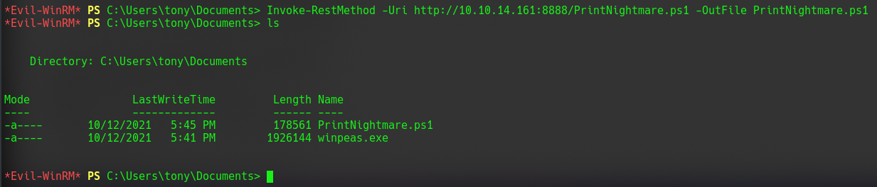 Really the only interesting thing WinPEAS found was a Print spooler process. After some Googling I stubled across this CVE. So lets get that exploit on the target machine in the same way we did with WinPEAS.