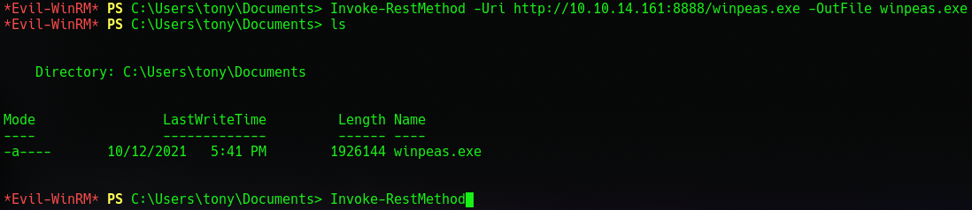 This was indeed the case and now we already have the user flag. For priv esc running at least WinPEAS is a no-brainer. So I used SimpleHTTPServer to get WinPEAS on the target machine.