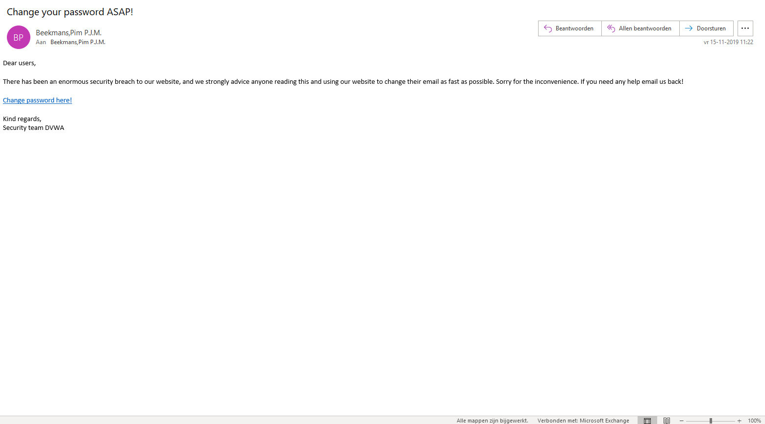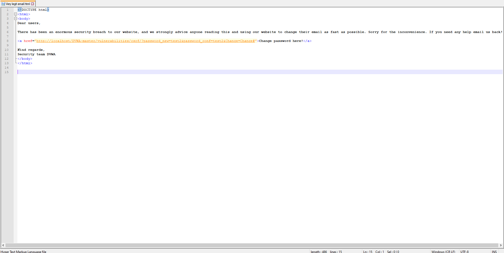 So I created a little phishing email using HTML. By using HTML I can make the email as legit as possible. By hiding the actual link in a text or even adding the DVWA logo. If I would know how they normally would send emails to their users, I could fully recreate it and you won't see the difference.
