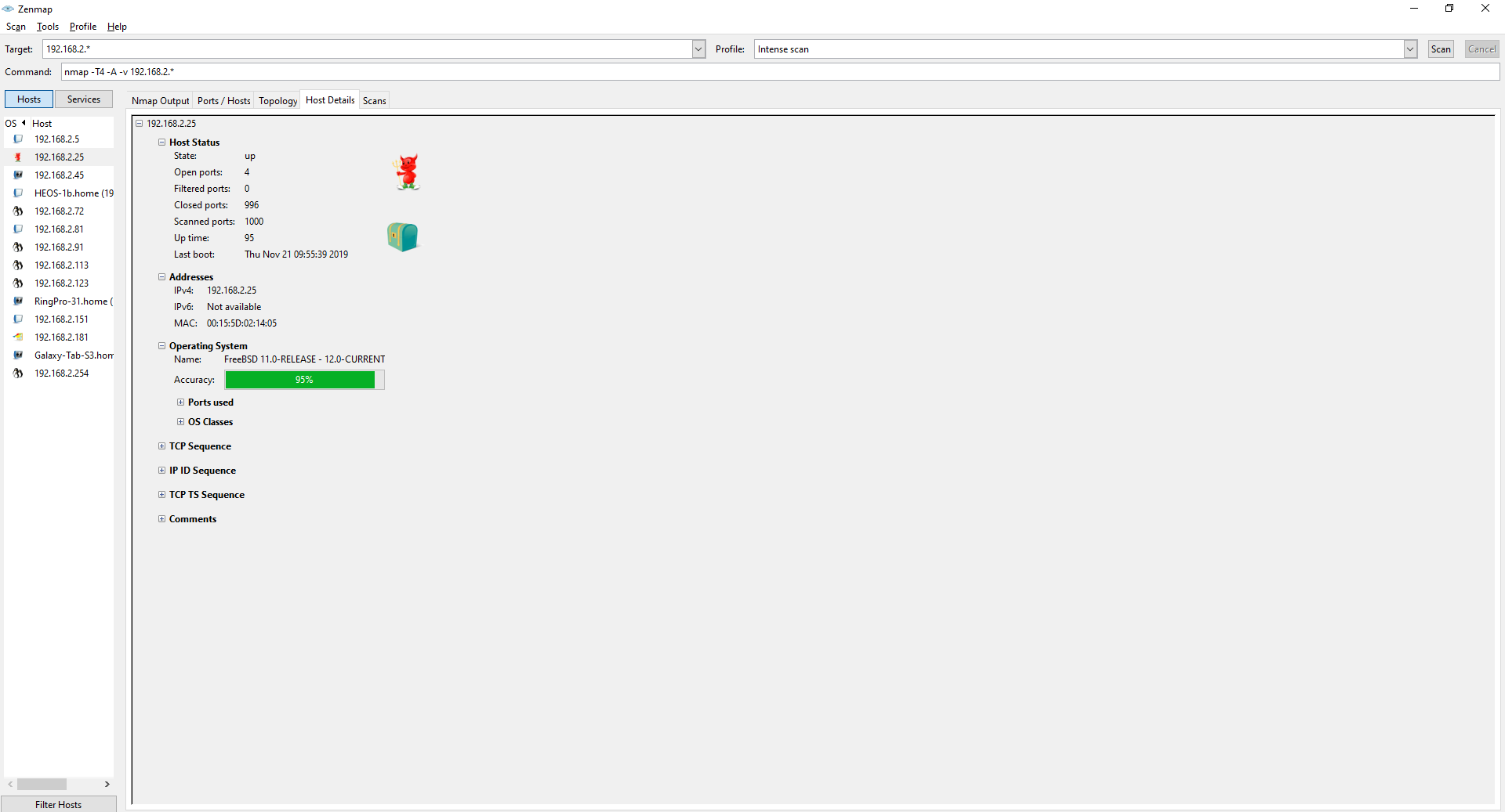 I did a network scan using NMap in the ip range that I was connected to. As you can see on the left hand side there are some machines that came up in the scan which I could take a look at.
