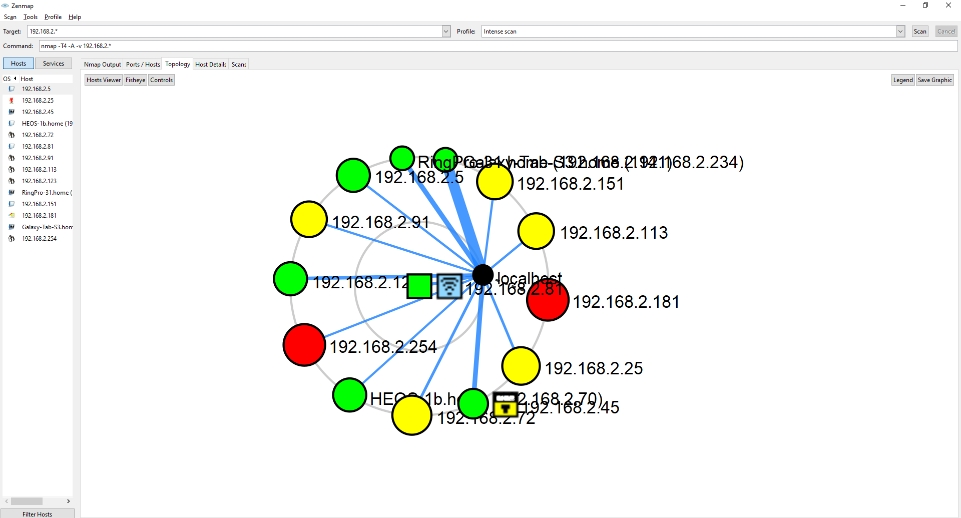 I took a look at the topology of the network first. This is a easy way to get an overview of the network, all with connected routers, AP's and switches. I can also see in this diagram that there are some devices in red which mean they have 6 or more open ports, those devices might be more interesting to me