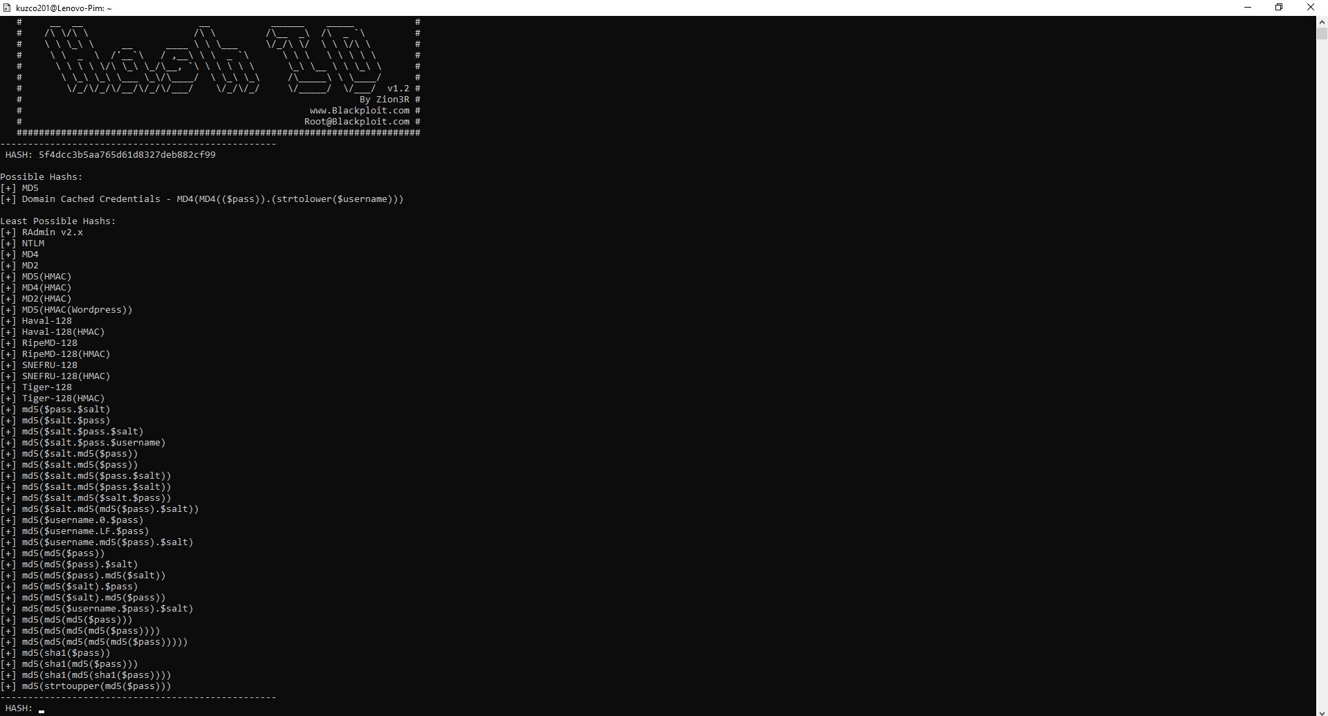 If I would have stole this hash from some database I might not know the hash type, which is important for me to know if I want to save time or use a rainbow table. So I ran "Hash-identifier" and gave it the hash. This gives me an idea what the hash type might be.