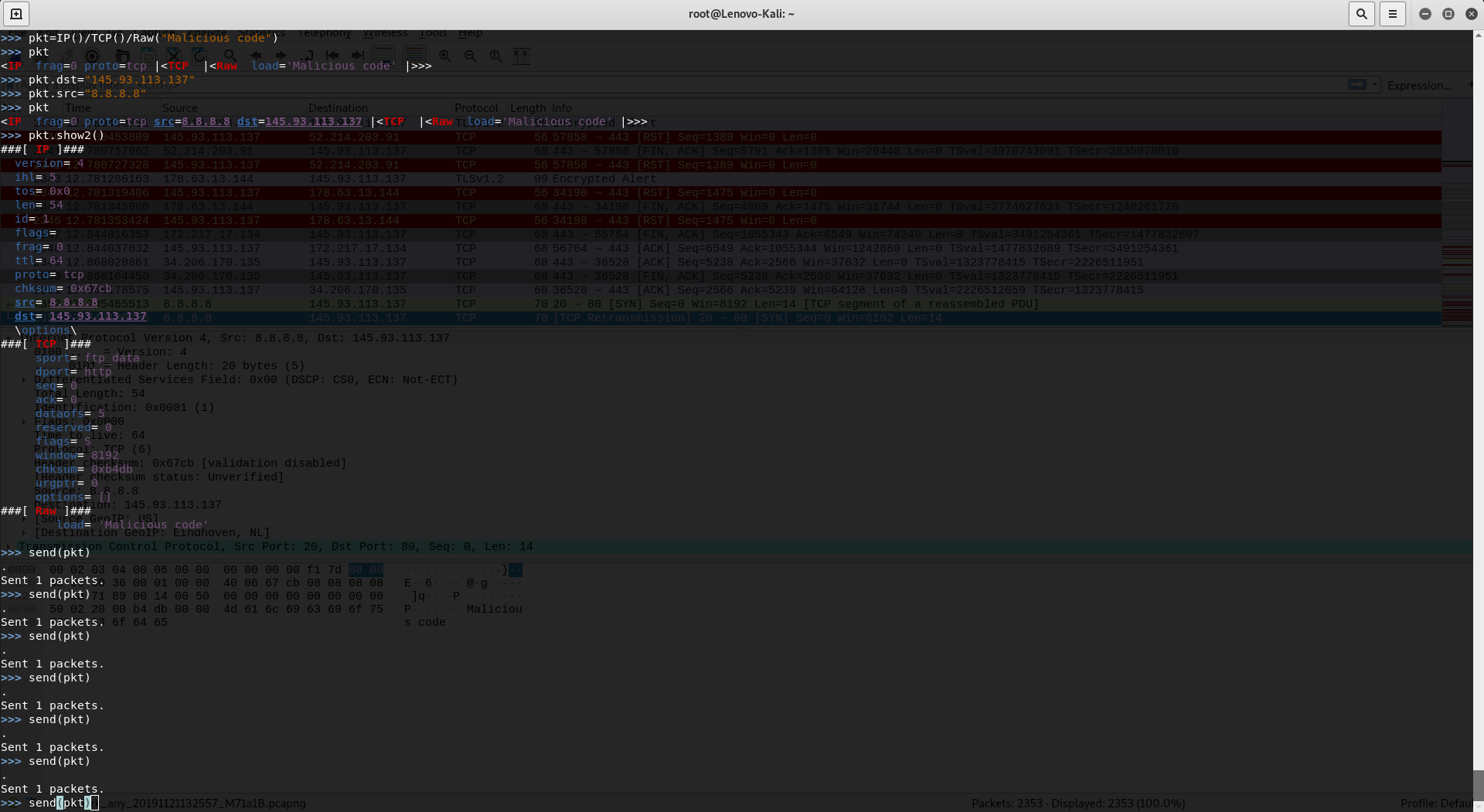 I created a fake IPV4 packet using "scapy". I made it so that it looks like the packet is coming from google, but It's actually from me and I put my malicious code in it.