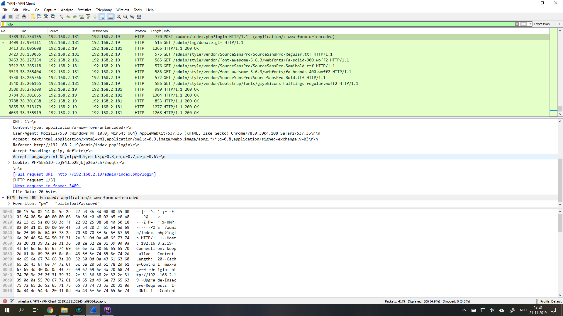 When I filter Wireshark to only HTTP and logged in in te website I can see my IP and the website's IP. When I open the packet and took a look what's inside, you can see the form post with password in plain text. Now this website doesn't hash the password so I can see the password in plain text, otherwise I would have seen a hash which I had to decrypt to get the password.